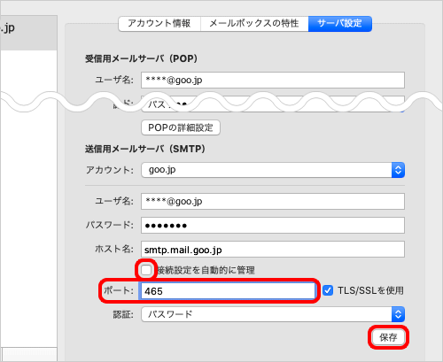 9.[送信用メールサーバ(SMTP)]の[接続設定を自動的に管理]のチェックを外し、[ポート]に 465 を入力します。