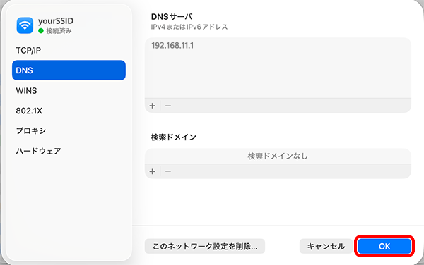 [DNS サーバ]の中のアドレスを選択し、下の[-]をクリックしてすべて削除します。