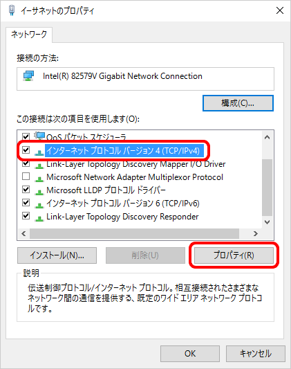 [インターネット プロトコル バージョン 4(TCP/IPv4)]にチェックが入っていることを確認し、選択して[プロパティ]をクリックします。