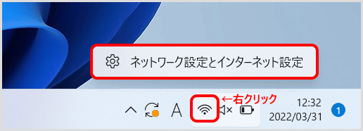 1. タスクバーの[Wi-Fiアイコン]を右クリックし、[ネットワーク設定とインターネット設定]をクリックします。