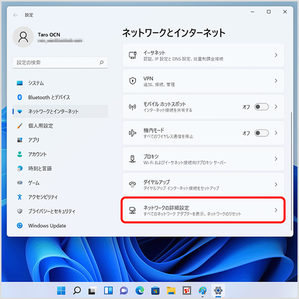2.[ネットワークとインターネット]画面が表示されます。 下にスクロールし、[ネットワークの詳細設定]をクリックします。