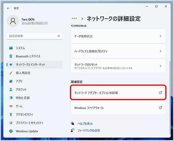 3.[ネットワークの詳細設定]画面が表示されます。 下にスクロールし、[ネットワーク アダプター オプションの詳細]をクリックします。