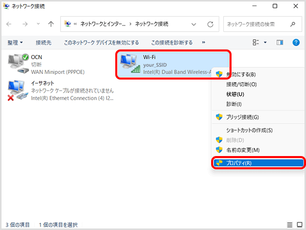 4.[ネットワーク接続]画面が表示されます。 ご利用の接続を右クリックし、[プロパティ]を選択します。