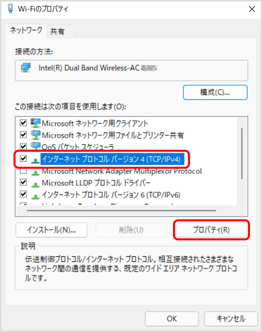 5.選択した接続のプロパティ画面が表示されます。 [インターネット プロトコル バージョン 4(TCP/IPv4)]にチェックが入っていることを確認し、選択して[プロパティ]をクリックします。
