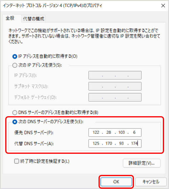 | 代替 DNS サーバー | 125.170.93.174 を入力 | 122.28.103.6 を入力 |