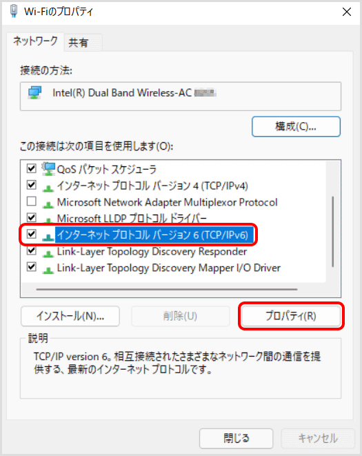 7.接続のプロパティ画面に戻ります。 [インターネット プロトコル バージョン 6(TCP/IPv6)]にチェックが入っていることを確認し、選択して[プロパティ]をクリックします。※ IPv6接続をご利用でない場合は、手順 9へお進みください。