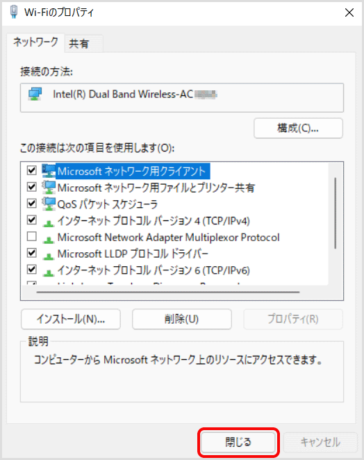 9.接続のプロパティ画面に戻ります。[閉じる]をクリックし、設定完了です。