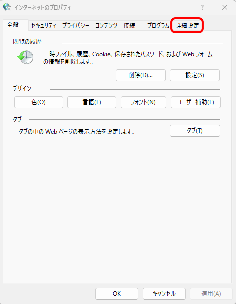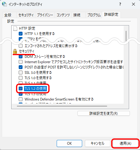 - [セキュリティ]欄の[TLS 1.2の使用]にチェックします。