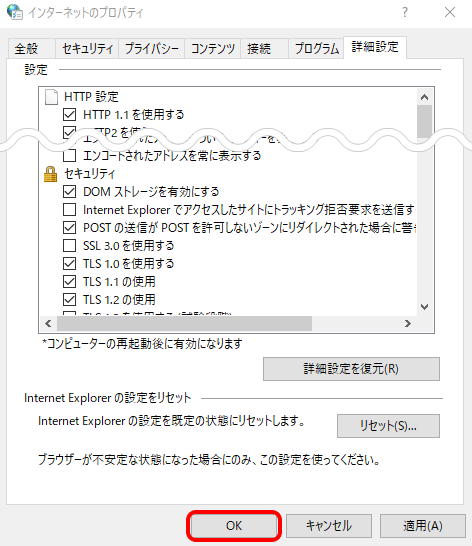 4. [セキュリティ]欄の[TLS 1.2の使用]にチェックします。