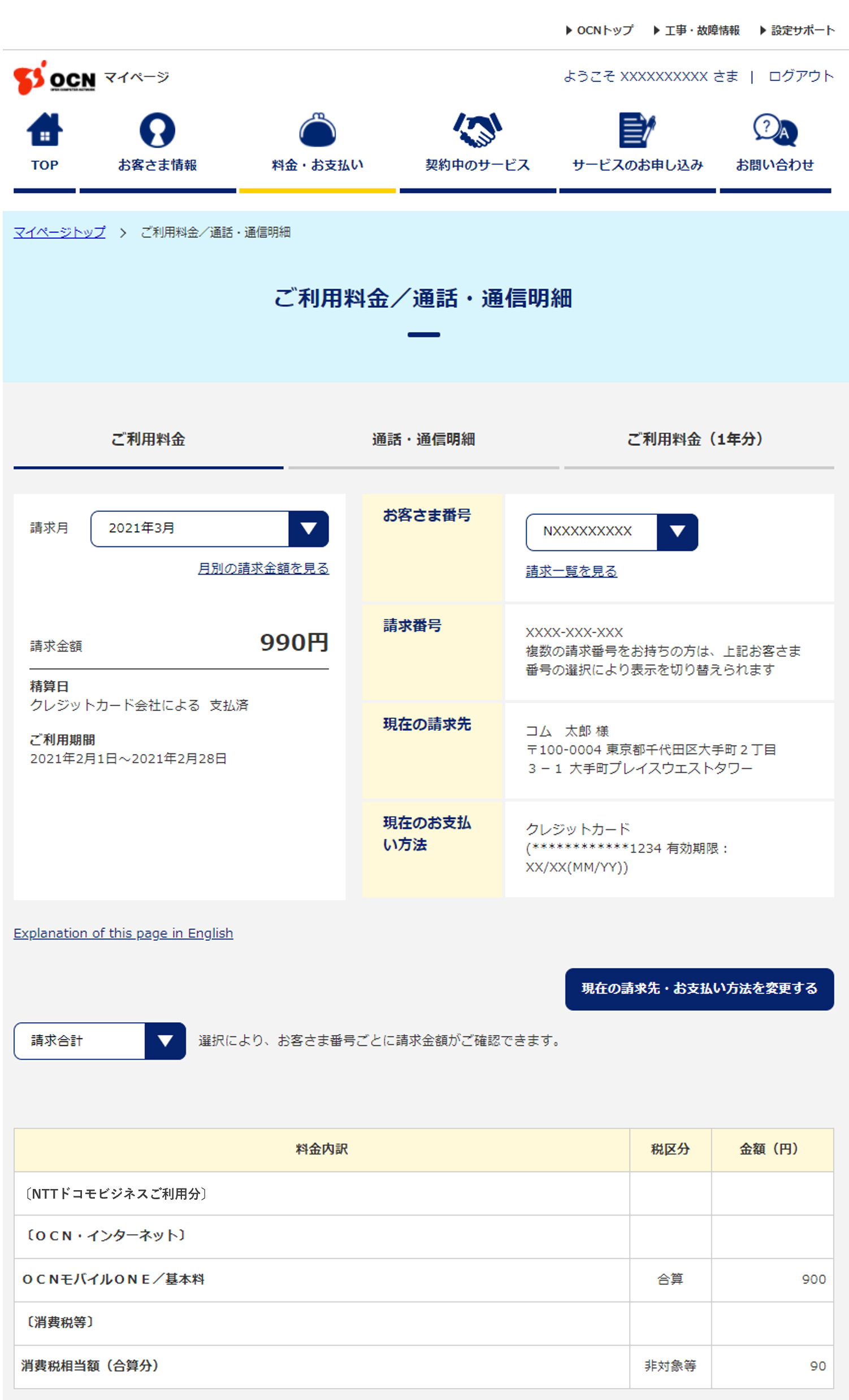 OCNマイページの「ご利用料金」ページ(サンプル)は下記をご確認ください。